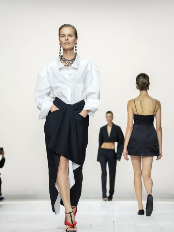 整个系列以白衬衫和围裹式半裙为基调,强调布料在身体上的自然垂坠与运动的自由。她将面料处理得如同呼吸一般轻盈,几乎拒绝任何与权力相关的硬质线条。