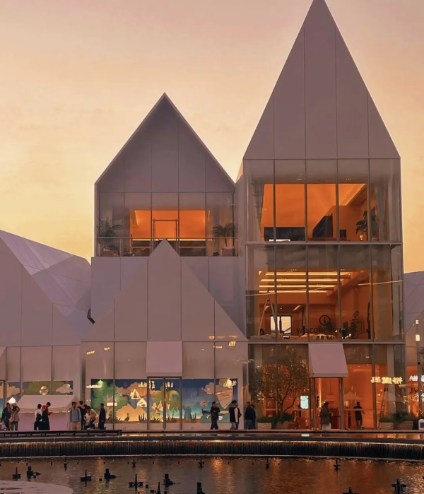 岩轴街区中,白色陶土瓦屋顶如同被风掀起的帆,沙丘水花园里没有促销广播的催促,只有吊床、阳光与被拉慢的脚步节奏,水轴中央约1200平方米的湖面,在白天承载亲子踩水的日常,在傍晚则自然转化为观日落的公共界面。