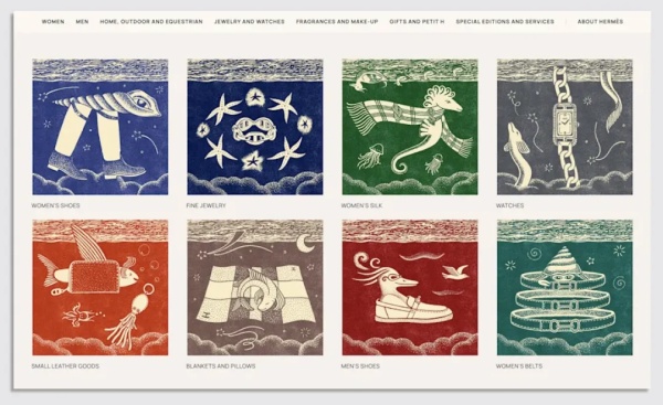 最终这个带有纸张颗粒感与不完美线条的水下生态系统,改造了整个品牌官网,令这一品牌门户焕然一新,可见艺术表达对爱马仕的重要性。