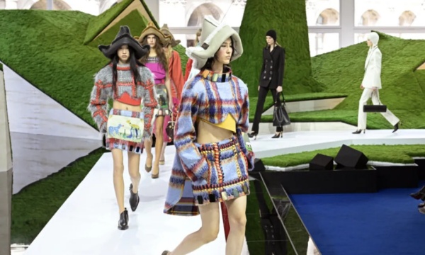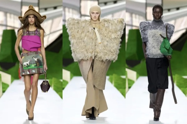 卢浮宫的一处隐秘庭院中,苔藓覆盖的几何结构隆起,模特穿着土耳其传统牧羊人外衣,肩部巨大得像机甲,羊羔皮帽檐向上弯曲成纸船,几套造型中嵌入的天真羊群图案,粗花呢夹克中织入了森林动物图案,工装背带裤以奢华缎面材质重新演绎。